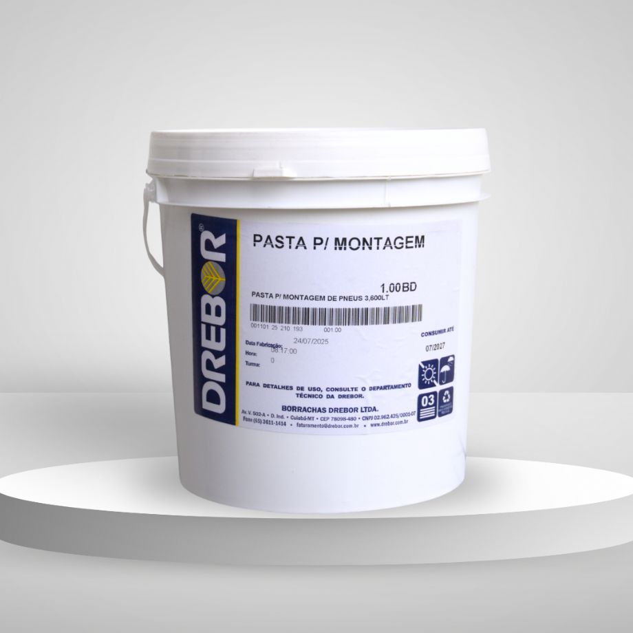 Específica para montagem de pneus, a pasta Drebor, é isenta de ácidos nocivos à borracha e ao metal, é fabricada com produtos a base de sabão anidro, usada para lubrificar os talões, aros e as rodas que estão em contato com o pneu.